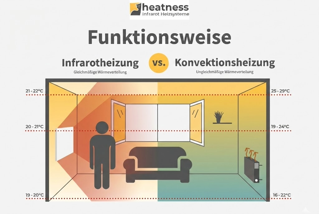 Anders als herkömmliche Heizungen, die nur die Luft erwärmen (Konvektion), arbeiten Infrarotpaneele mit Strahlungswärme. Die Infrarot-C-Strahlen erwärmen direkt die Körper und Gegenstände im Raum. Diese speichern die Wärme und geben sie gleichmäßig wieder ab.