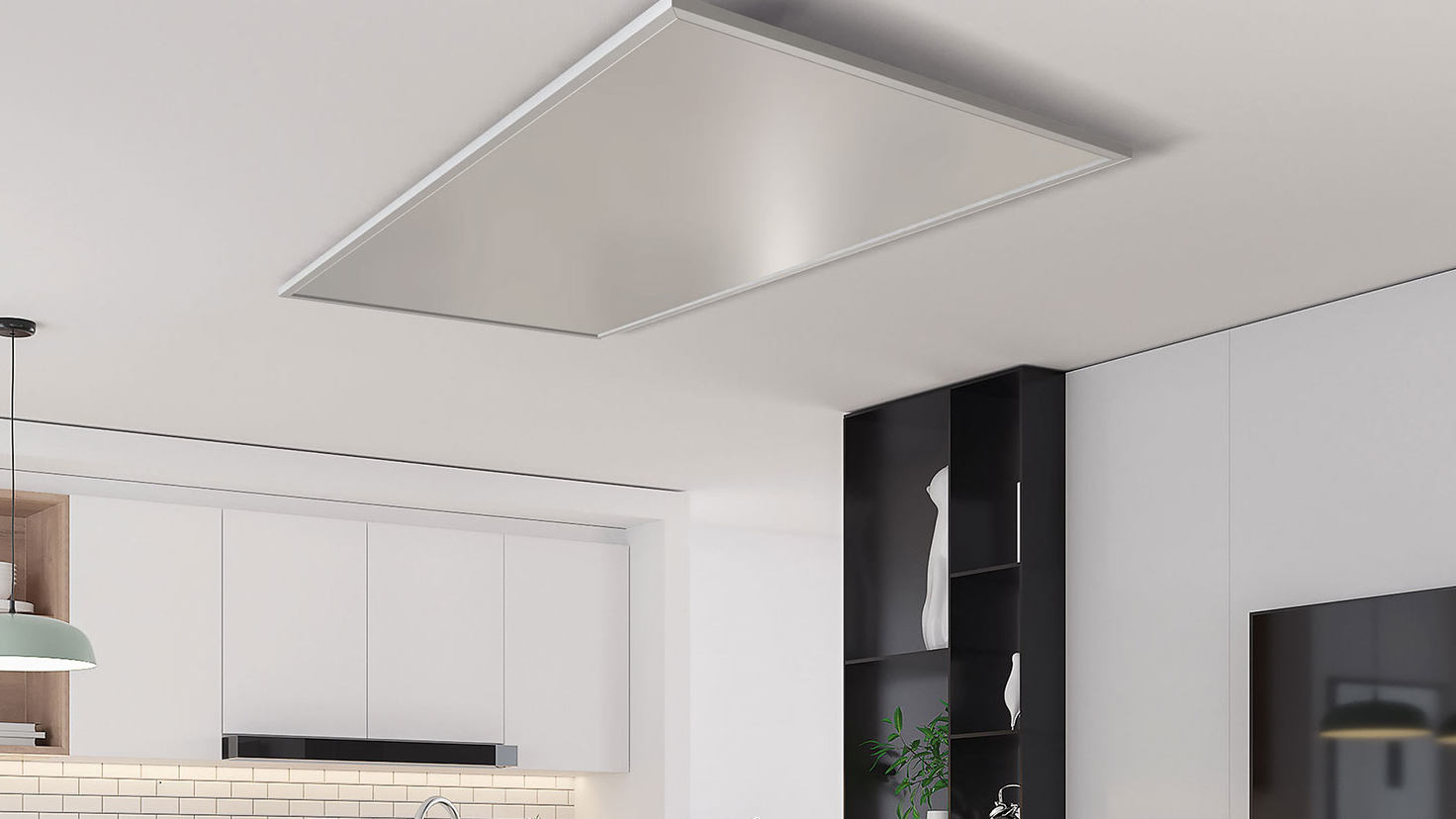 Deckenmontage ist die platzsparendste Option in der Küche. Der Boden bleibt komplett frei – wichtig bei einer vollausgestatteten Küchenzeile. Ein weiterer Vorteil: Der Fußboden wird direkt von oben erwärmt, ähnlich dem Effekt einer Fußbodenheizung.